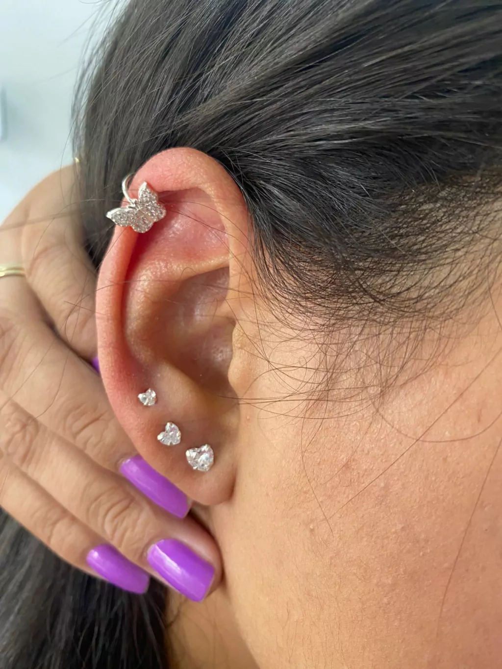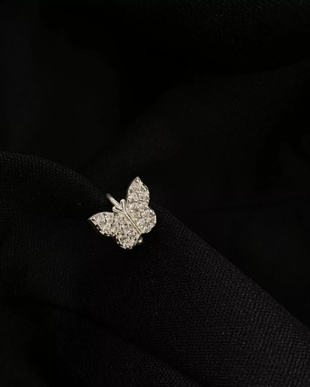 Piercing fake orelha borboleta cravejada prata legítima 925